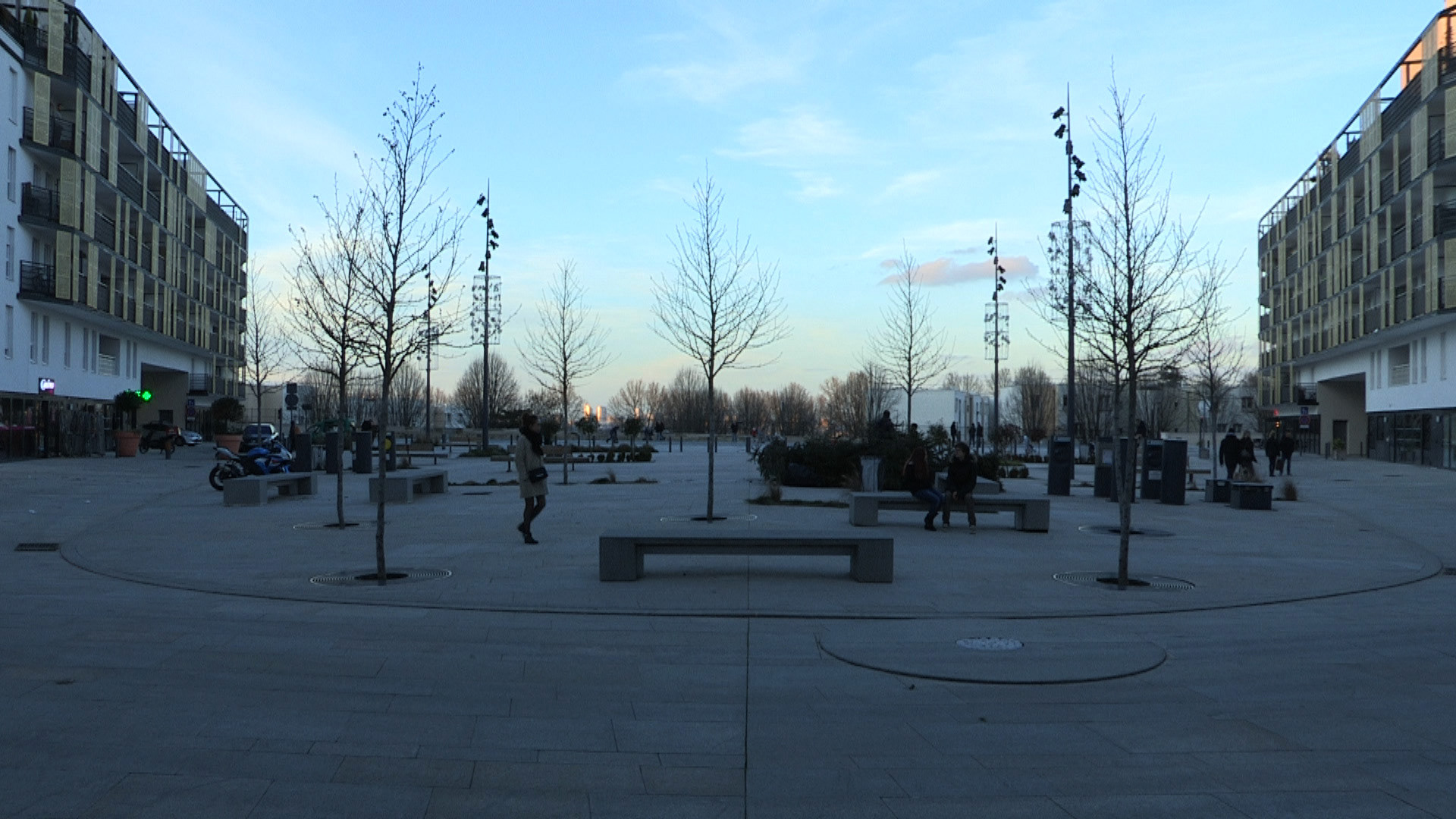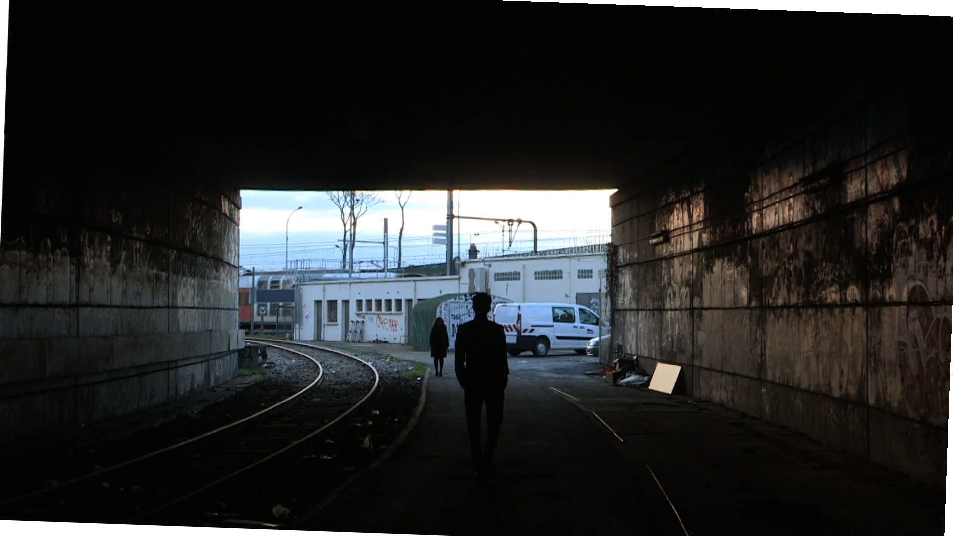 2-Ils partent chacun de leur côté. Ils traversent des espaces urbains. L’enjeu de la mise en scène sera de faire résonner la traversée de ces espaces avec leur état d’esprit.